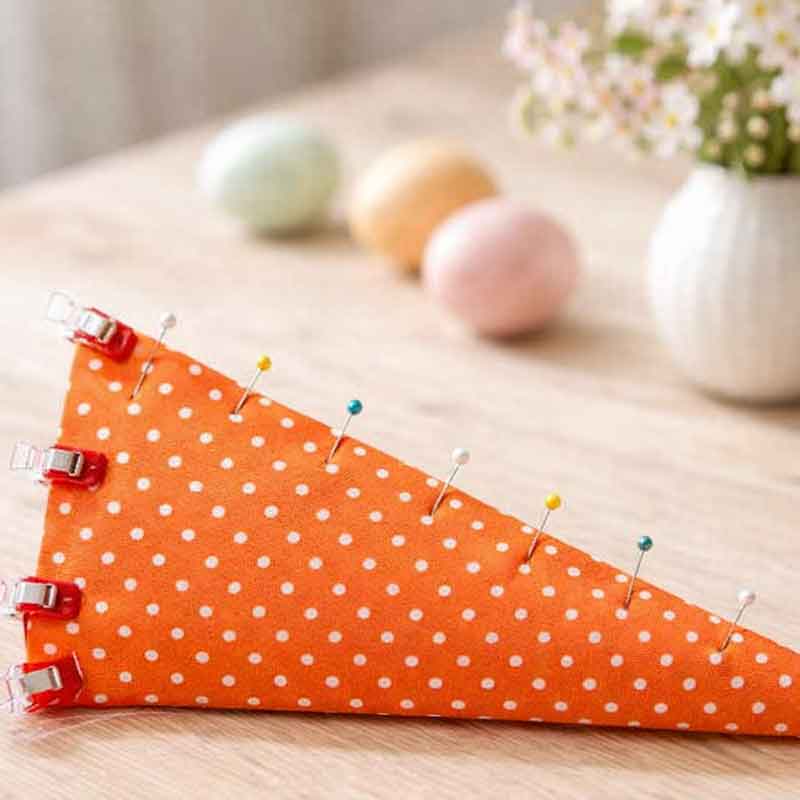 Schneide ein Dreieck aus deinem orangenen Stoff zu. Wenn du magst, kannst du die Spitze leicht abrunden – so wirkt die Karotte natürlicher.